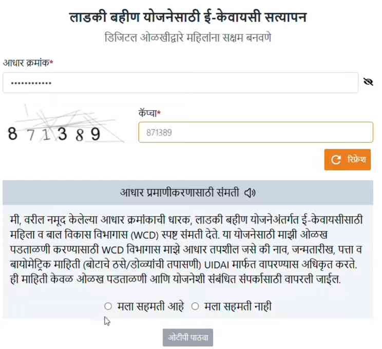 • स्टेप १: ladakibahin.maharashtra.gov.in हे Portal उघडा आणि e-KYC विभाग निवडा. १२-अंकी आधार क्रमांक प्रविष्ट करा आणि captcha कोड भरा.